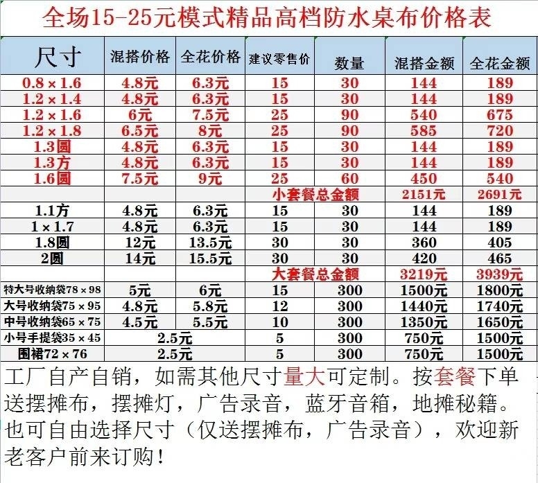 防水防油桌布,收纳袋各种尺寸齐全,(图一尺寸价格表)全花、混搭都有,支持混批300个起批,送录音➕广告牌➕摆摊布13989436351微信同号