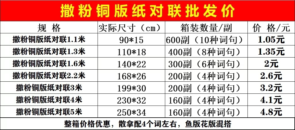 【撒粉铜版纸对联】2023年新品上市,跑量王,详情请看价格表1⃣️对联五个尺寸1.1米1.3米.1.6米.2.2米.3米.4米.5米,4到6种字句款式字句混搭发货,黑金可选,需要抓紧时间,整箱拿货价格优惠…… 电话微信同号188675632