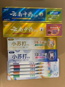 牙膏3件套金装升级版,金装中药180克+金装小苏打110克+牙刷一板5支装批发价格6.5块钱一套,288套起批 卖15元20元模式,好的产品,好的模式,过硬的质量 合理的价格,才能有好的销量!牙膏家家户户必备品,无淡季