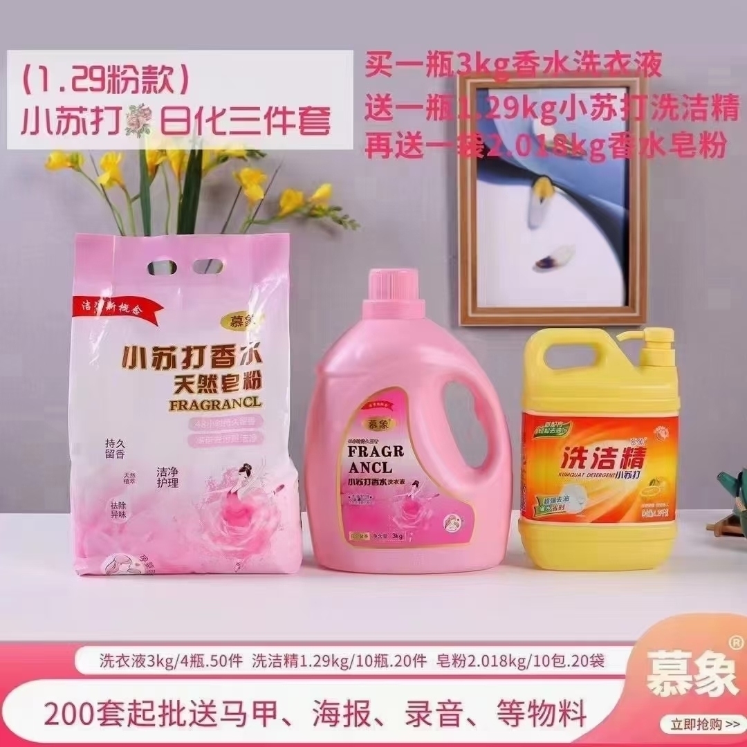 各种日化套餐 39元模式,慕象阳光好太太三件套,四件套买一桶3㎏小苏打香水洗衣液,送一桶1.5㎏洗洁精,送一包2.018小苏打香水皂粉,日销千套不是问题❗批发价18元一套(可发样品55元一套包快递费)13989436351微信同号给