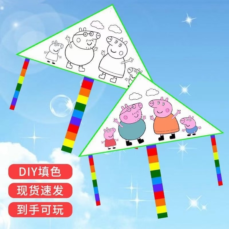 DIY涂鸦教学风筝。1⃣️:涂鸦风筝一套包含:风筝+8色涂料+画笔一支+30米线板。2⃣️:卡通风筝带30米线板,3⃣️:都是平纹布的材料,4⃣️:尺寸为:70X70X100厘米。涂鸦教学风筝3.8元一套,200套起批。