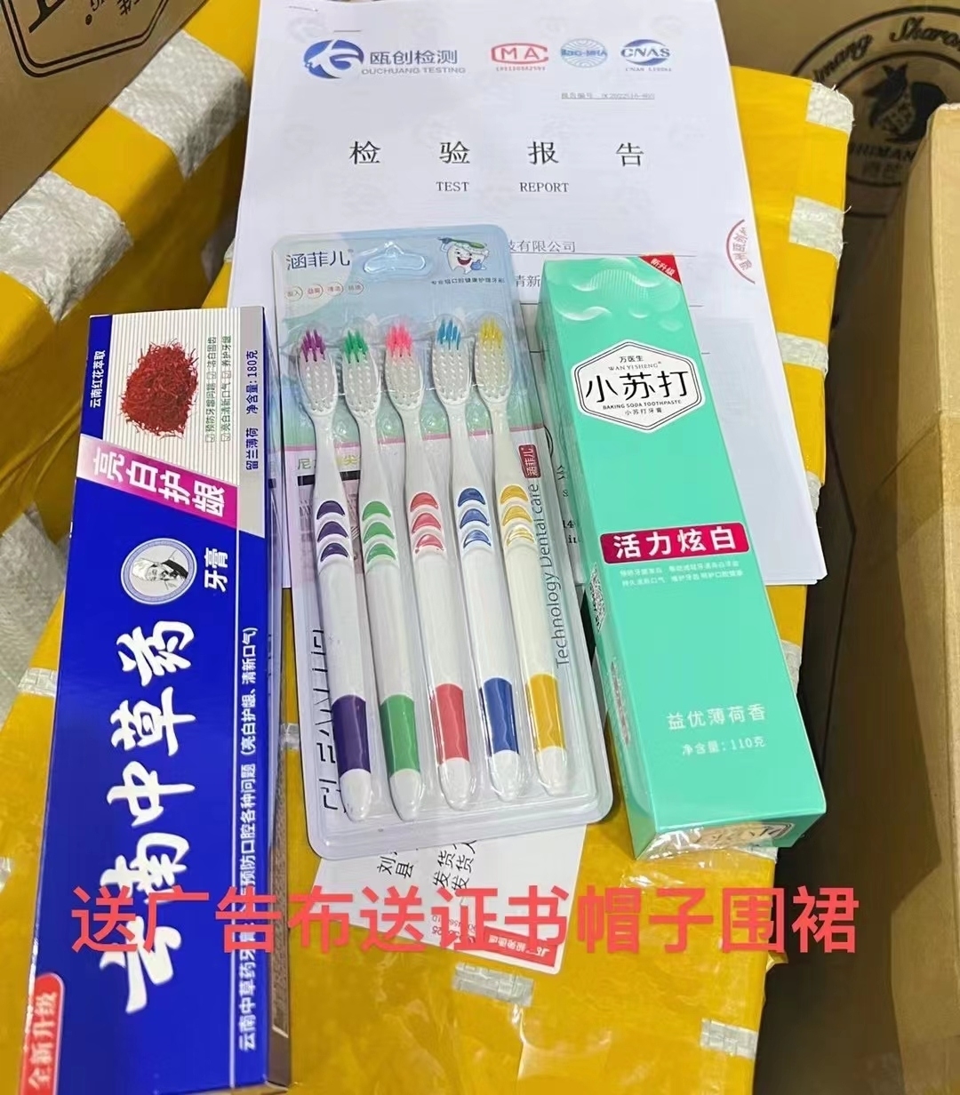 zj2.1.2D热卖产品:实拍图,牙膏三件套每天大量出货,多种套餐自由选择销售10-15元模式,批发价只要4.6一套牙膏牙刷是日常消耗品,没有淡季之分,一年四季都畅销,下单送广告布送录音,送帽子🧢围裙,证件齐全,保证正品,销售模式简单,多