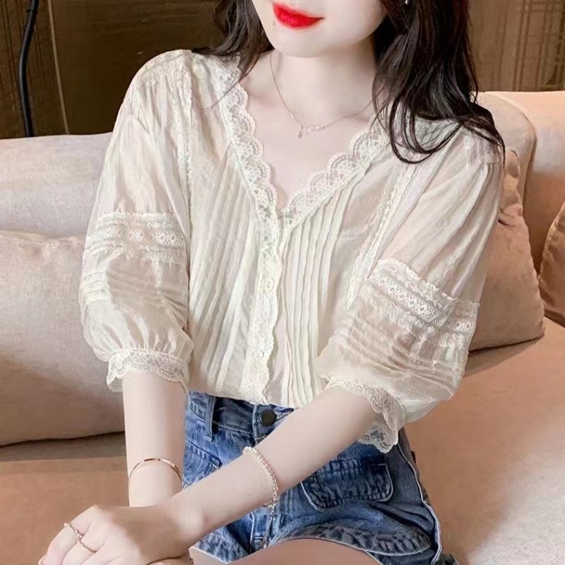 天丝衬衫女夏季法式V领蕾丝拼接镂空洋气半袖百搭别致防晒上衣潮 200件清货价个位数 18657970519(微信电话同步)