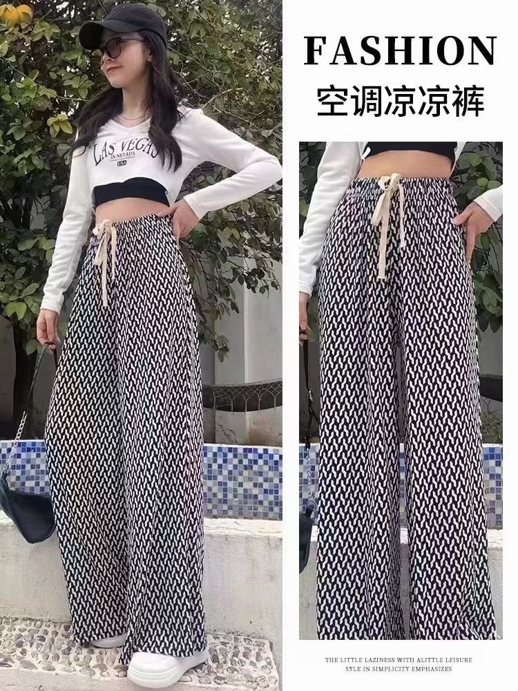 冰丝棋盘格阔腿裤女夏2022新款印花裤高腰宽松垂感格子休闲裤 50条起批11.5💰💰💰