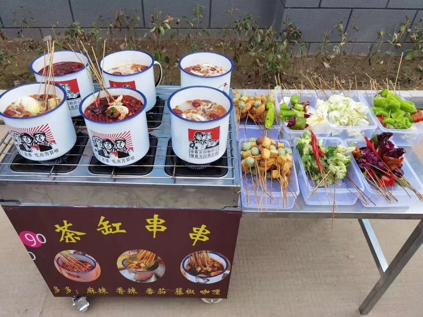 拿货850元全套设备 火爆大街小巷的茶缸串串移动推车 全套设备配置如下: 1、移动推车一辆 2、折叠操作台一个 3、新一代电子打火6头专用灶 4、专用煤气接管一个 5、专用阀门一个 6、定制版加厚加大茶缸6个 7、配方一份 8、专用烤网 9