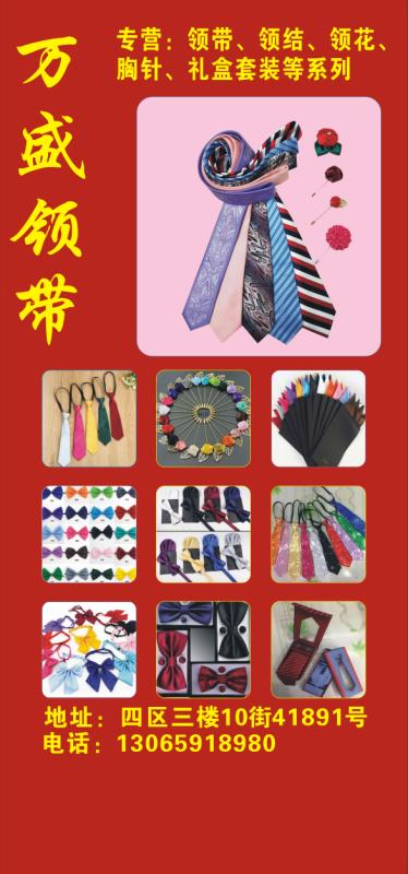商铺介绍: 本公司位置在国际商贸城四区三楼10街41891 。主要经营领带,领结,胸针,精品礼盒套装,拉链领带,各种规格的定制工装领带 详细