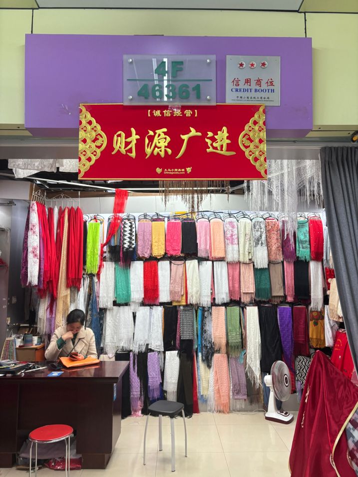 商铺介绍: 该商铺位于义乌国际商贸城四区81门4楼9街46361,经营大类: 围巾,面积: 15.0平方,主营商品: 三角围巾,长巾,沙滩巾,装饰腰带,花边 详细