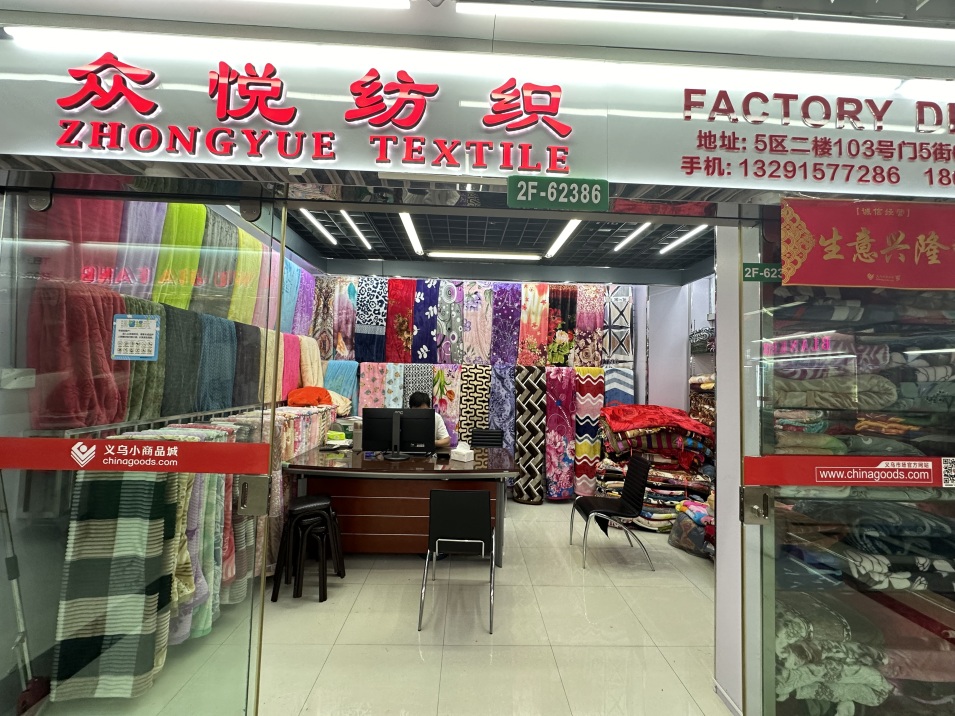 商铺介绍: 该商铺位于义乌国际商贸城五区103门2楼5街62386,经营大类: 床上用品,面积: 15.0平方,主营商品: 纺织品 详细