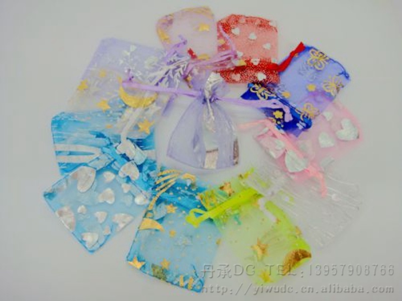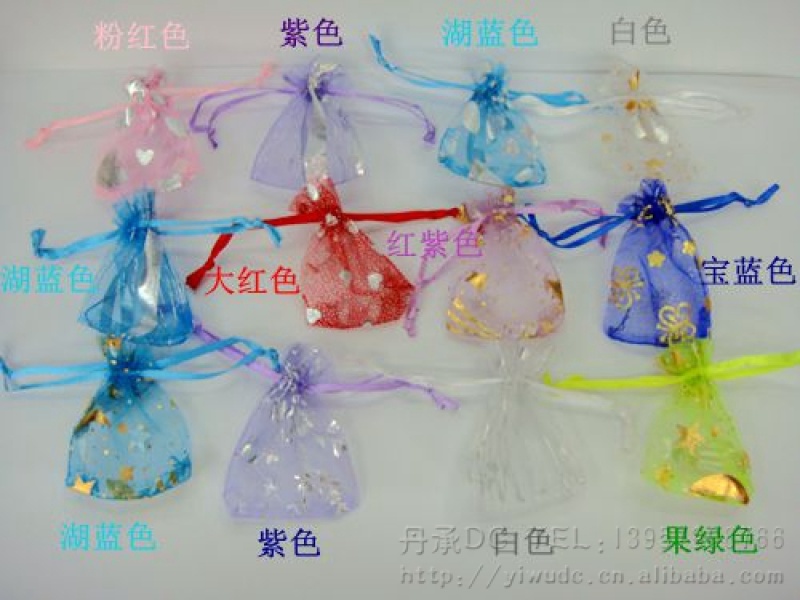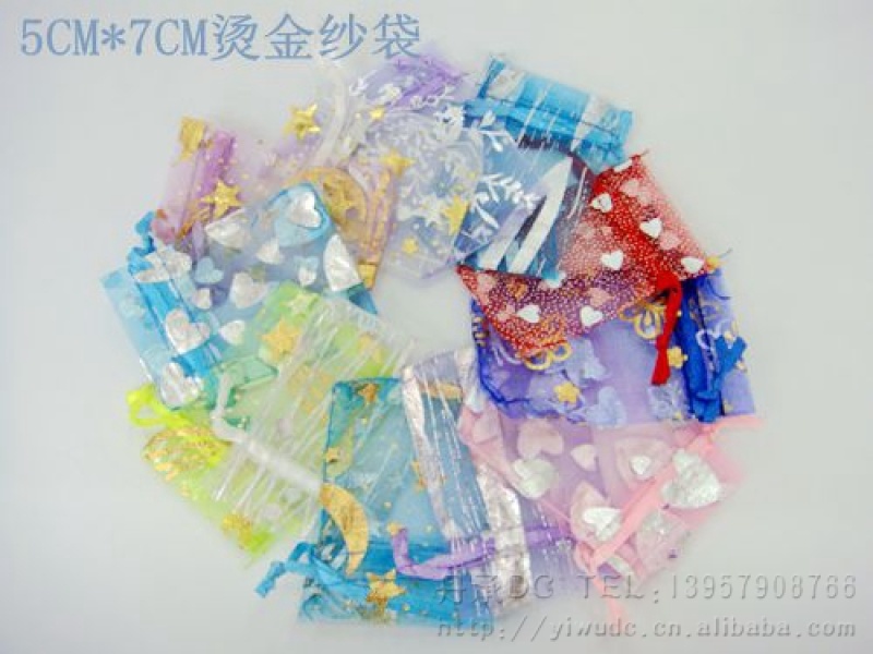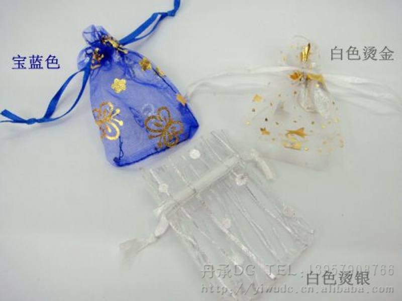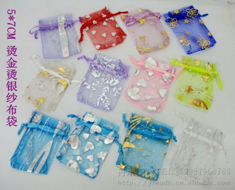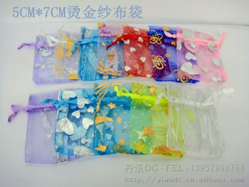 烫金纱布礼品袋系列用烫金纱网布设计制作而成, 纱网布上,印上精美的图案,颜色各色都有,规格可按客户要求定做,批发价格面议,高雅,时尚,色彩艳丽,可以用于各种物品的装放,同事间可以用于各种礼品的包装和点缀,可以使得礼品显得档次更加高.深受各个年龄阶层的朋友喜爱.