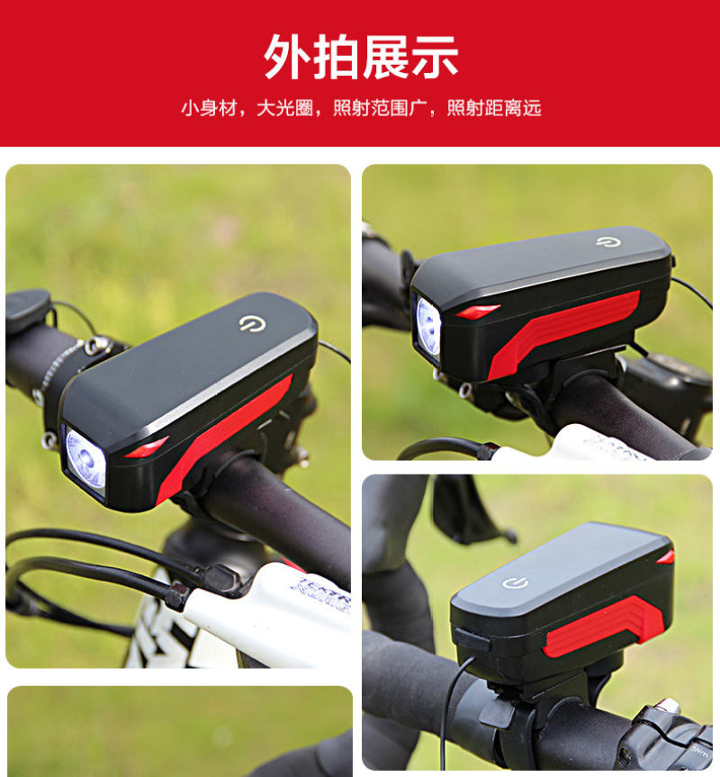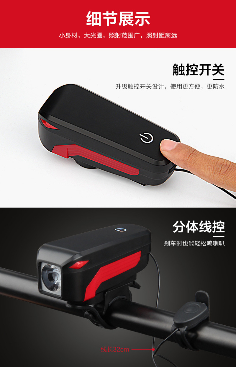 【开关】前灯开关在主机背部,触摸控制,喇叭开关在手把硅胶绑带上,线长38cm;
