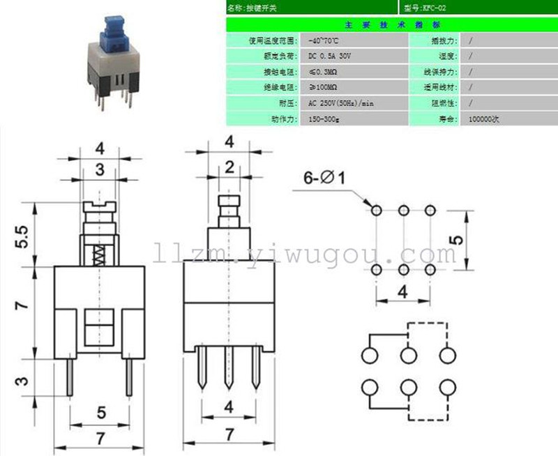 【产品型号】:7*7自锁开关:7*7自锁 无锁 平头 高头 单排两脚 单排三双排六脚 【产品尺寸】:7*7MM 【产品材质】:塑料、铜 【产品颜色】: |