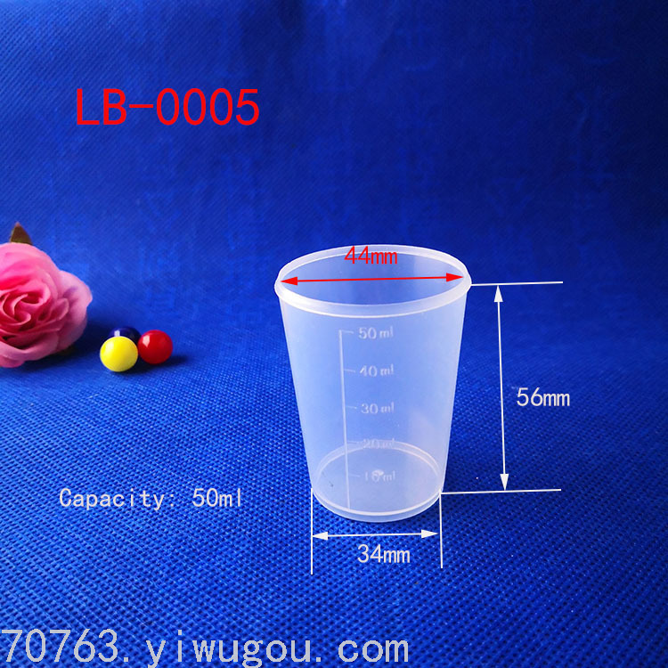 这款量杯是用PP料做的量杯,产品上口直径44毫米,下口直径34毫米,高56毫米,产品一个箱子5