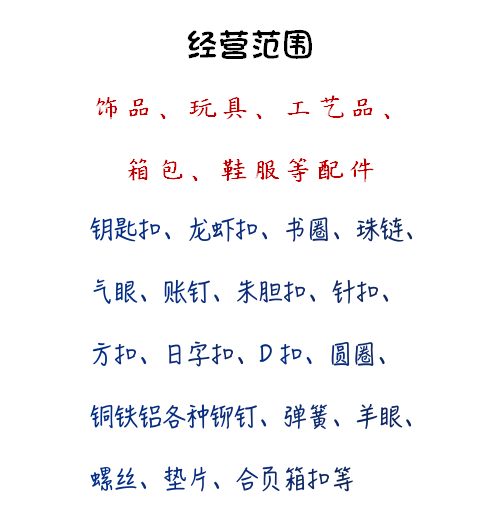 本店主要经营匙扣、匙圈、龙虾扣、卡圈、珠链、汽眼、帐钉、猪胆扣、磁扣、针扣、方扣、三档扣、半元、元圈、铜铁铝各种铆钉、弹簧、羊眼、螺丝、垫片、合页箱扣、工艺、相框、箱包配件等。