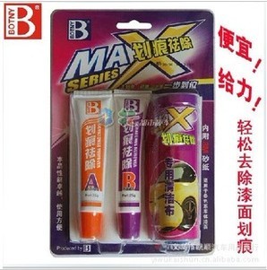 1. 划痕修复剂: 本品特为漆面处理短小划痕而设计。其所含的活性分解磨砂、填充剂成份分解后能快速填充并修复漆面划痕。轻松去除车漆表面上的氧化膜与难以清除的顽固污垢、漆斑、毛刺,使漆层重现光彩和色泽。可迅速去除车漆的各类桔皮和漆面未深及底漆之划痕,使用后产生之极细旋纹,可使用B漆面晶膜蜡做后续工序圆满处理,可达到车漆光亮如新的效果。
