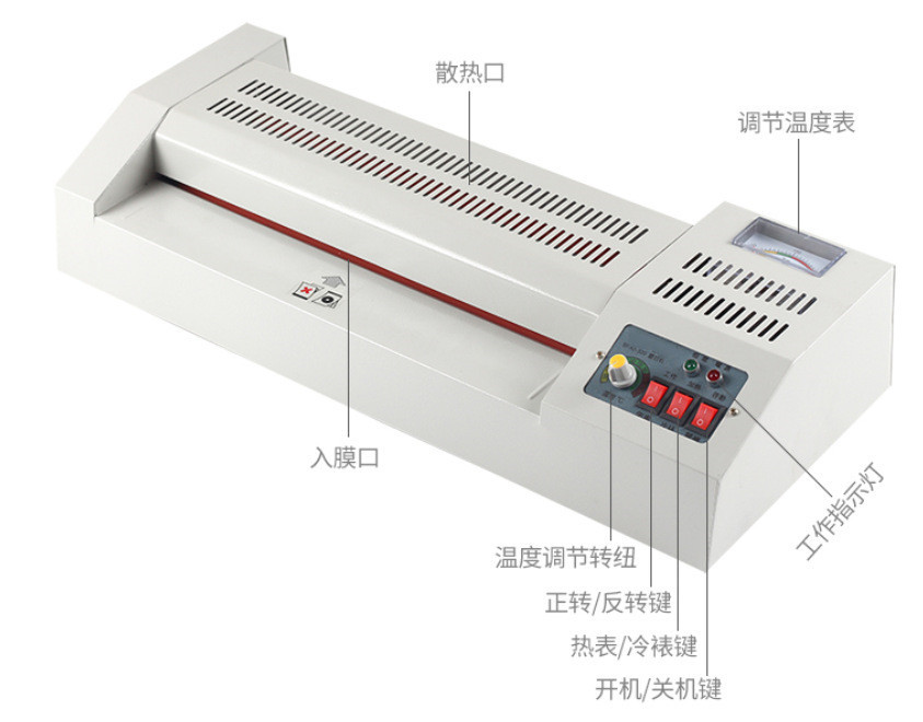 本机有电源开关、工作倒车开关、加热开关电源指示灯(红色)恒温指示灯(绿色)温度设定旋钮.电子控温、胶辊传热,国产、进口卡片均可使用,温度可调,有倒车功能及冷裱作用.