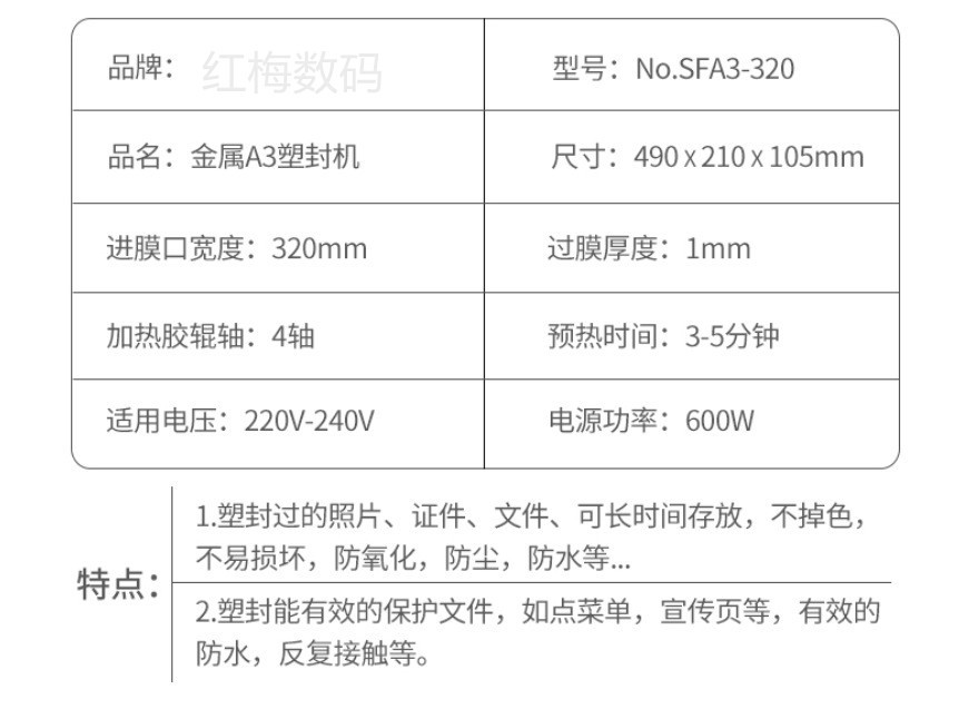 很多顾客只认为能过塑就好,买普通塑料壳塑封机就够了。其实这是个误区,本机器为A3塑封机,并不是简单的加大了尺寸和换了铁壳。而是增加了胶辊厚度、马达功率、压力以及温控精度。平整度和压实程度远远超出普通塑料壳塑封机。