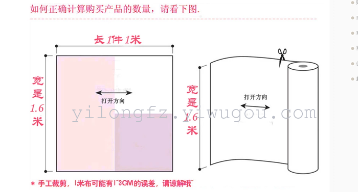 由于布料经营的特殊性,以及人工裁剪的难度性,请各位请体谅做生意的辛苦,职业差评师以及专挑毛病的请慎拍,完美主义者请慎拍。来本店购物即是一种缘分,本店掌柜真诚地与每位亲合作,真心地祝愿购物愉快