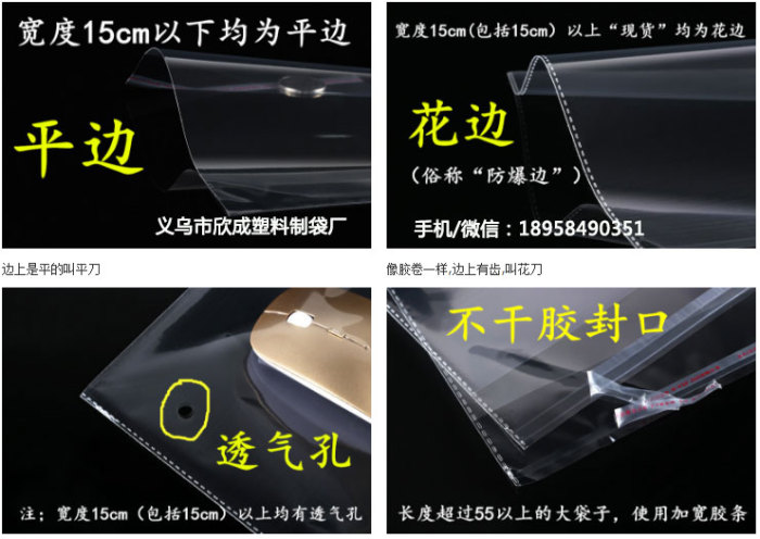 注:袋子的边有两种,一种边上是平的,叫平刀;另一种像胶卷一样,边上有齿,叫花刀,一般情况下,宽度在15厘米以上的全部是花刀生产(好处是不容易撕裂损坏),所以,实际使用宽度要减去0.5厘米左右,请君算好!