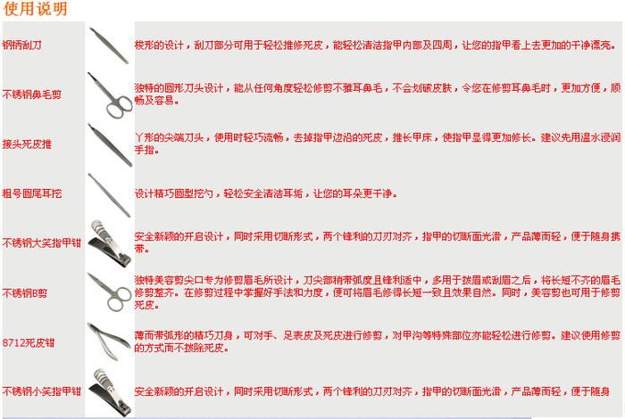 【包含物品】平口指甲刀、斜口指甲刀、弯头多用剪、耳勺、粉刺针、眉夹、指甲锉、死皮叉、关刀挑