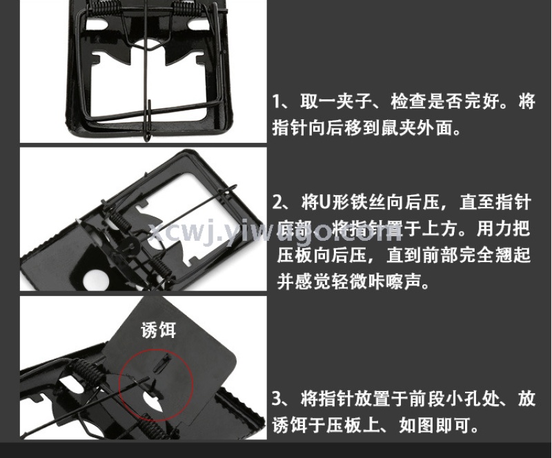 第五步:为了提高捕鼠效率还应在击鼠器的踏板和两侧的地上撒些稻谷等食物,以引诱老鼠在不知不觉中走进击鼠器。 注意事项及掌柜建议(为了安全和成功捕鼠,请耐心阅读) 1.本产品是击杀老鼠的专用器具;为了安全,小孩和弱者不得使用!只有熟悉本产品性能后才可使用!2.捕鼠是复杂而细致的系统工程,器械捕鼠更需要耐心,