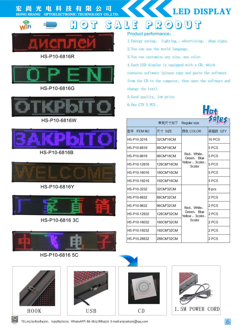 功 能: 可以显示中文,英文、数字,俄语,阿拉伯语 时间 温度等多种世界语言,支持多种炫彩边框效果、支持图片自定义边框。可以储存10多条信息。支持20个节目,每个节目支持16个区域同时播放,每个图文支持10条信息。支持45种显示信息的方式(循环,上移,下移,立即,右移,左移….)。