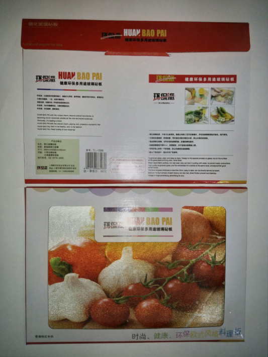钢化玻璃菜板是目前国外流行的环保产品之一,用钢化玻璃制做,不易破碎,即使碎了也呈圆颗粒状,不会割手,与汽车玻璃是同一工艺;除了用大板斧剁肉骨头不能保证不碎外,其他的如鱼、蔬菜、瓜果等都可以用这块美丽的砧板加工,轻便,时尚。它克服了木头和塑料菜板不易清洗,易污染环境等缺点。具有清洗容易,不污染食物和环境,不怕摔,不怕烫,用途多等优点。另外,此产品采用花纹玻璃及透明方便实用的厨具,又是装饰您厨房的特色工艺品,也是圣诞等佳节的礼品。图案色彩逼真.既可当菜板也可当隔热垫,杯垫,真可谓是一板多用,背面四个角上各有一个防滑垫,使其固定。使用方法:切菜,水果沙拉,西点,日本料理等