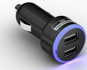 1、车充设有两不同电流的输出口,供选择不同设备充电使用。
