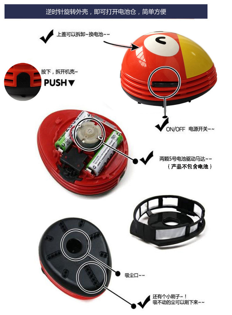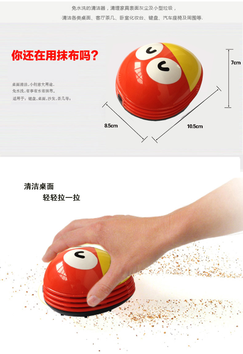 只要开关一下就能去轻松完成办公桌面、电脑键盘、家居表面、汽车坐垫等场所的除尘工作。吸力强,使用2节五号电池(产品不包含),可以吸附小到灰尘、饼屑、橡皮渣、头发丝,大到米粒、纸屑、泥土沙石等。