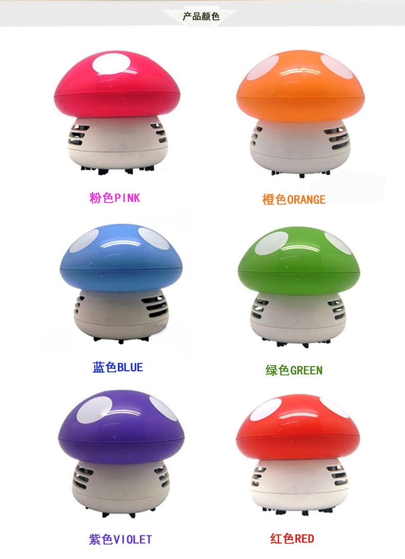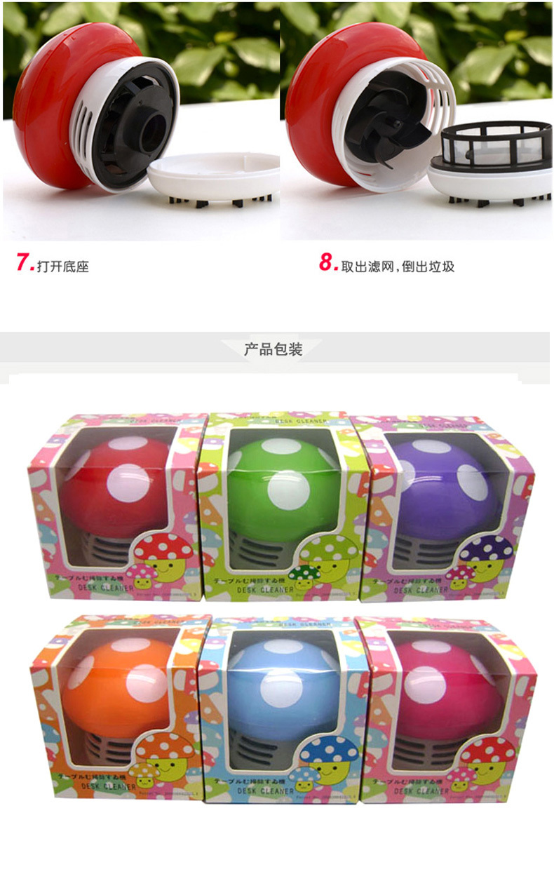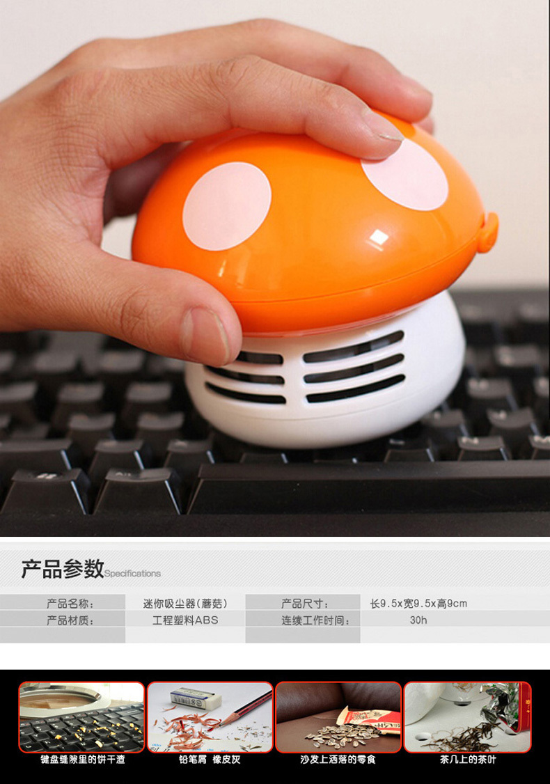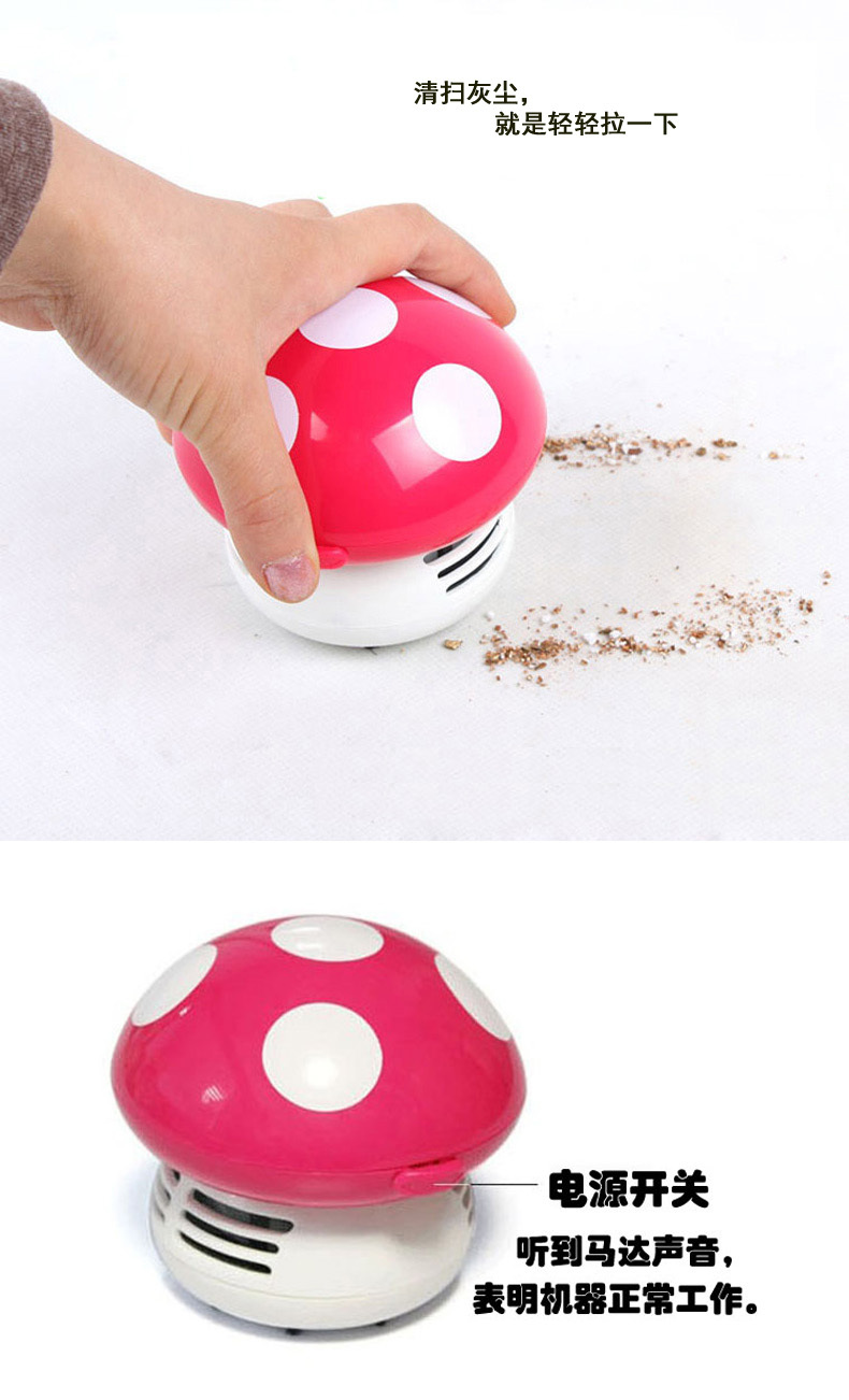 卡通蘑菇造型,使用2节五号电池(产品不包含),可以吸附小到灰尘、饼屑、橡皮渣、头发丝,大到米粒、纸屑、泥土沙石等。时尚美观,既是桌面吸尘器,也是摆饰工艺品!