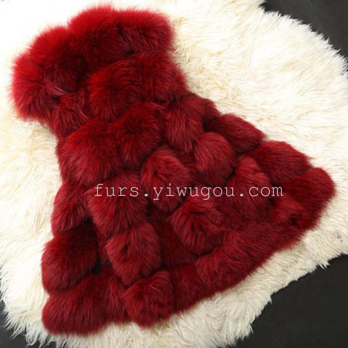 酒红色拼接皮草马甲 裘皮外套 狐狸毛大衣 时尚