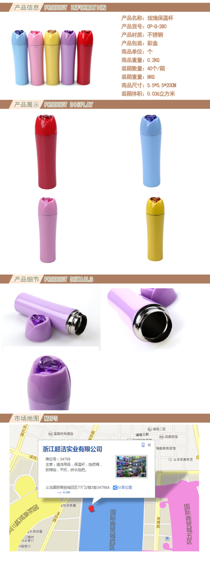 产品名称:玫瑰保温杯 产品货号:CP-G-280 产品材质:不锈钢 产品包装:彩盒 商品单位:个 |
