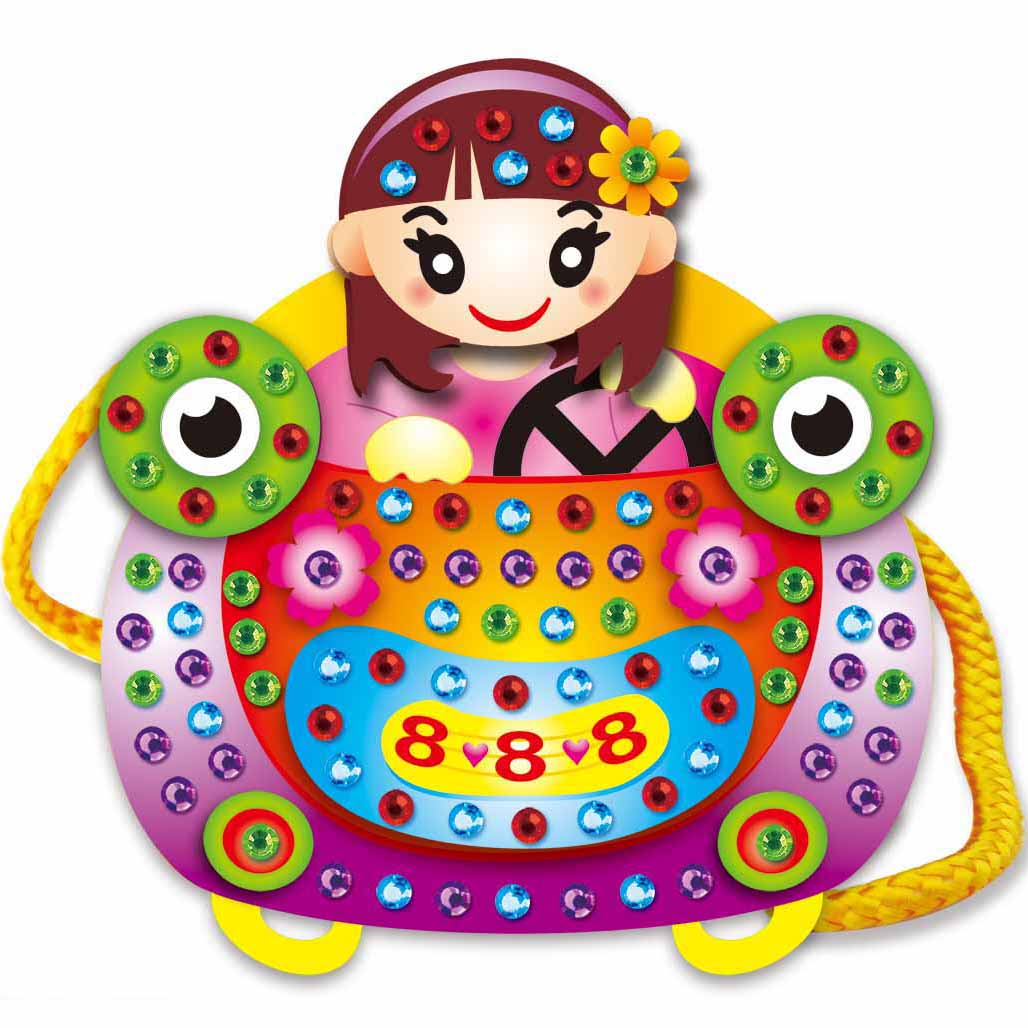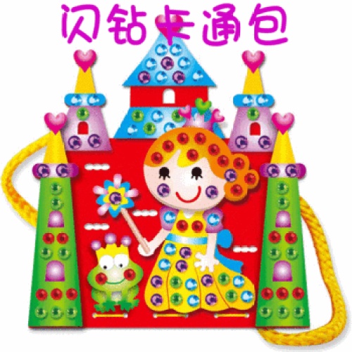 又是一款可爱的DIY包包,配有闪亮钻石贴,培养孩子动手能力的趣味玩具,共12款图案,材料包约17*12.2cm2,600包一件。拍前请电话或添加客服QQ确认,支持小额混批、支持在线网银支付宝或线下交易