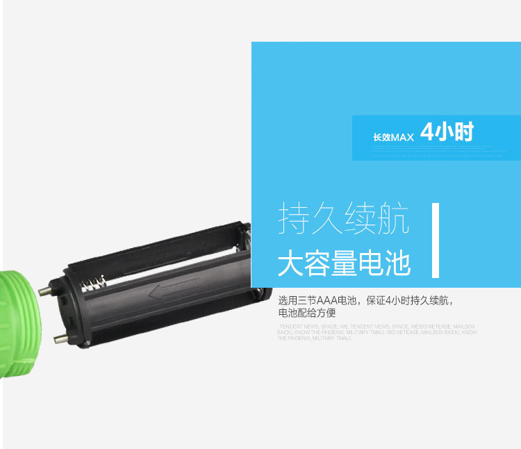 1. 装电池:将“尾盖”旋开,然后按照电池盒内的正负极标识装入3节AAA七号电池,如果发现装入电池后,灯不亮,请立即取出电池,检查电池是否按照要求装入的;最后旋上尾盖(产品不含电池)。
