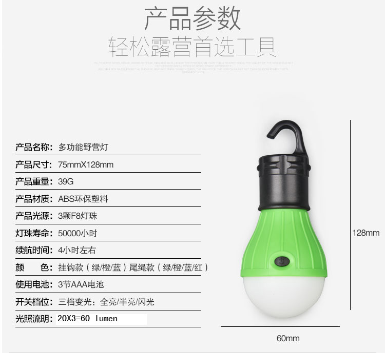 3.产品带挂钩,可挂在帐篷里,墙上,树枝上,绳子上等地方,使用方便直接。