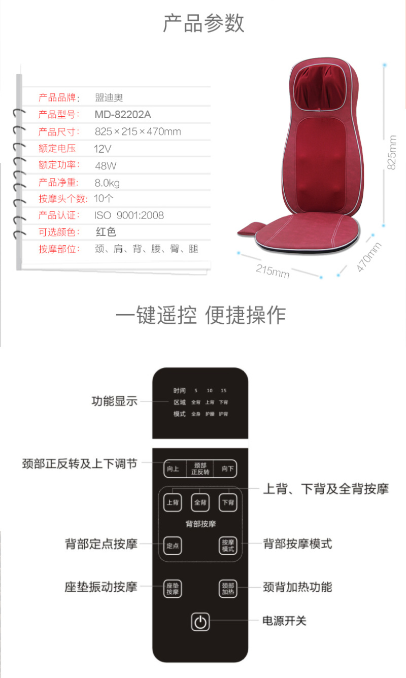 盟迪奥MD-82202车载多功能全身家用按摩加热揉捏靠垫