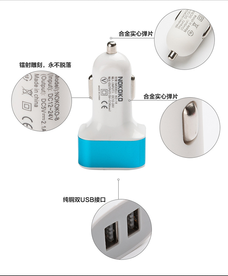 2、电流:1A(3口同时工作会共享此电流)2、铝合金车载充电器輸出端提3、铝合金车载充电器含输入反向、过温、过电流、短路多重保护措施及自动重启动功能,让产品更安全,让您使用更安心、放心。