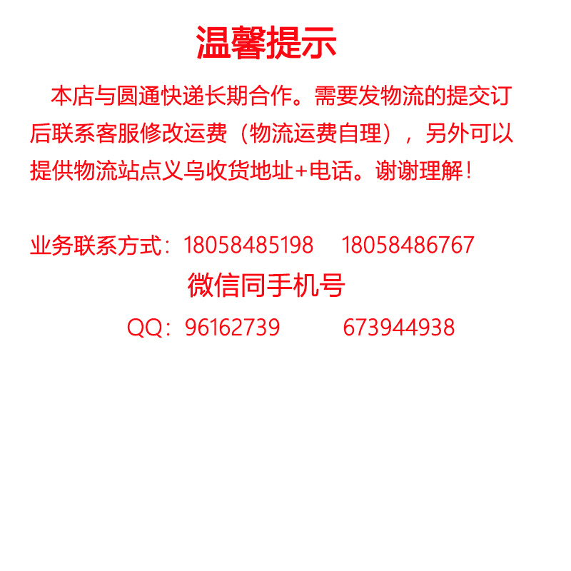 2、义乌是全国的物流中心,到各个地方的物流都有,一般我们都是在物流园里面发货。运费到付。客人如需指定物流,可直接告诉我们客服或者下单留言说明。当然,客户也可发德邦、华宇、佳吉、新邦这样的品牌物流,不过运费稍贵点!