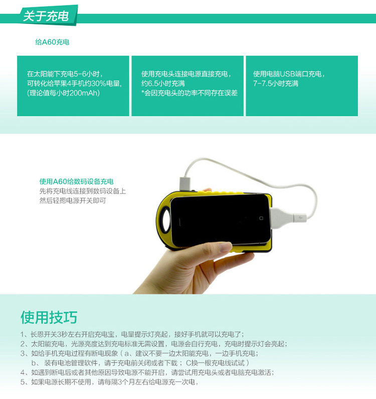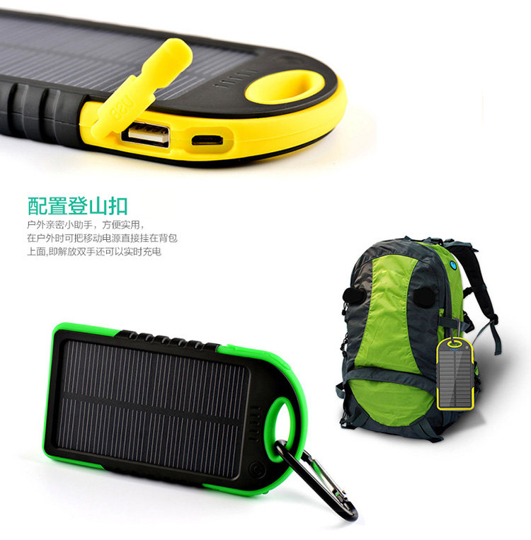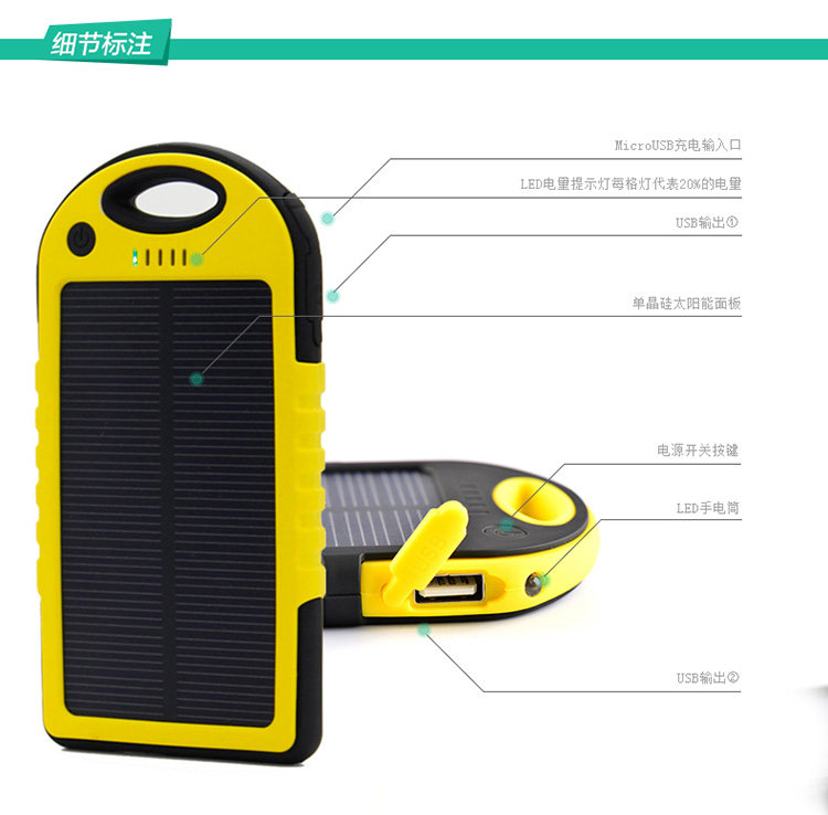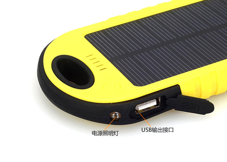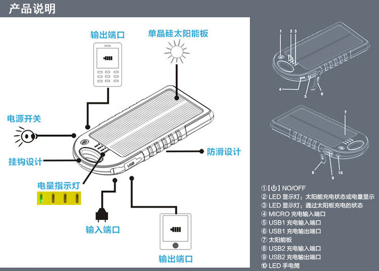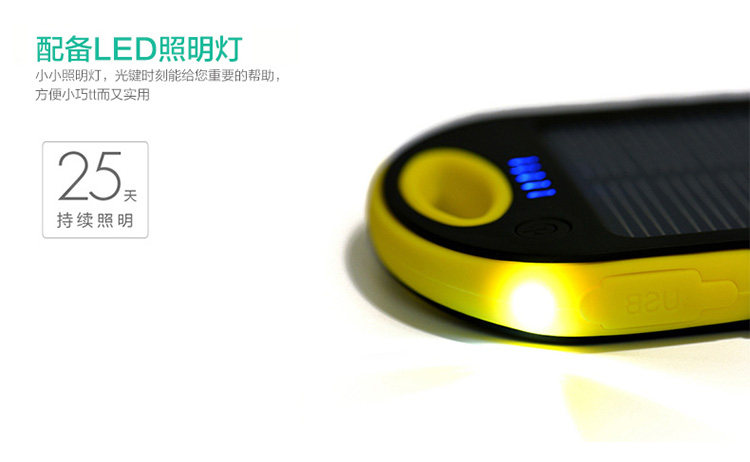 6、快速识别:1格太阳能充电指示灯,5格电量显示灯(30%、70%、100%),随时随地了解你的电量状况;LED照明灯设计,有助于户外旅行使用