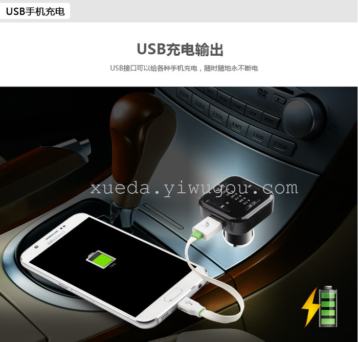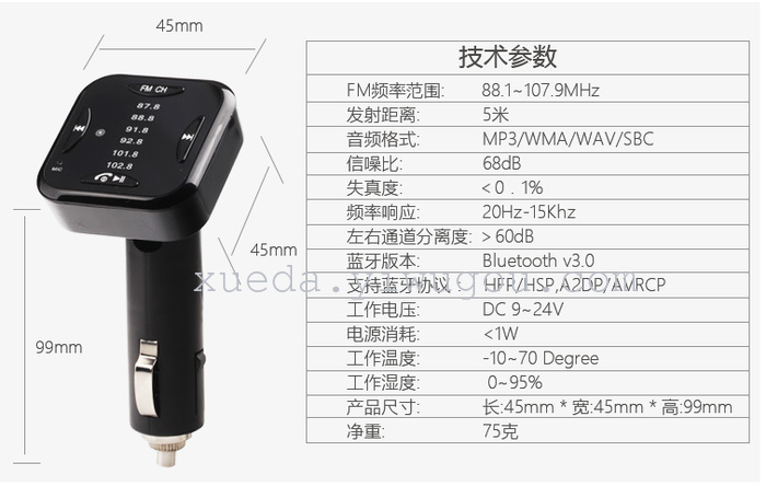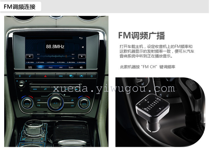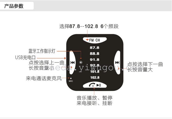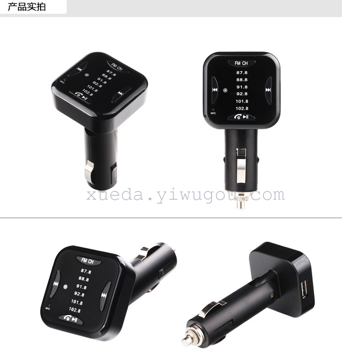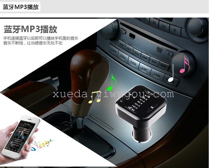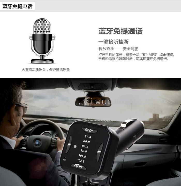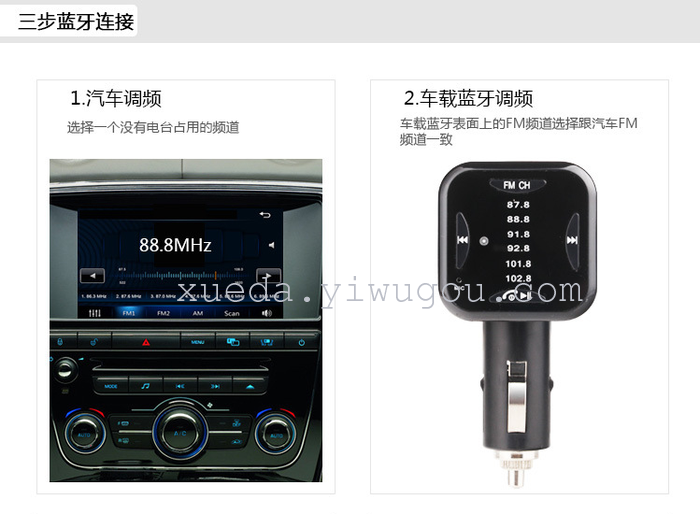 本产品是一个具有车载蓝牙免提功能的产品,它内置FM发射、和立体声蓝牙无线传输芯片,将手机里面的音频或歌曲通过汽车音