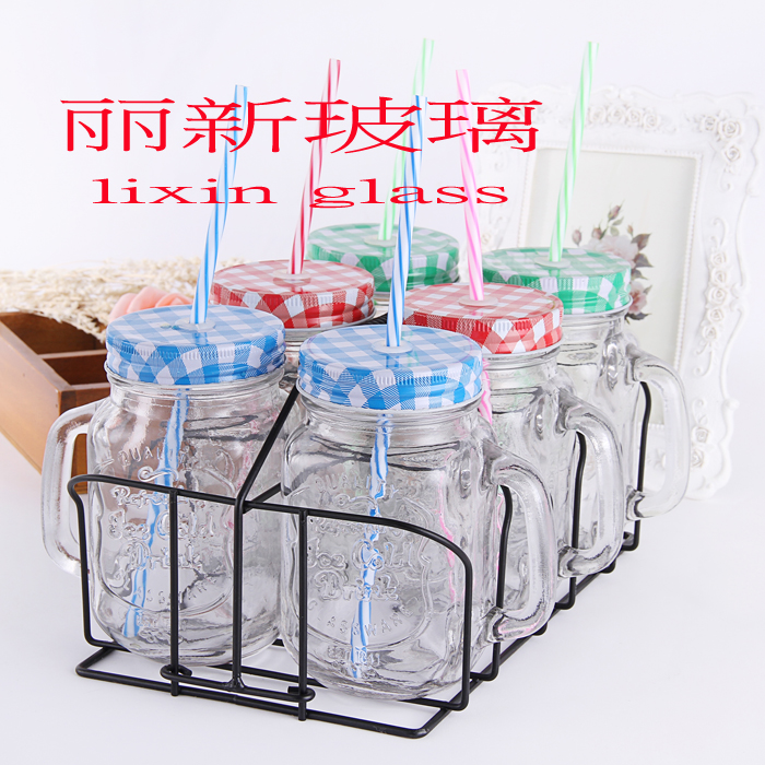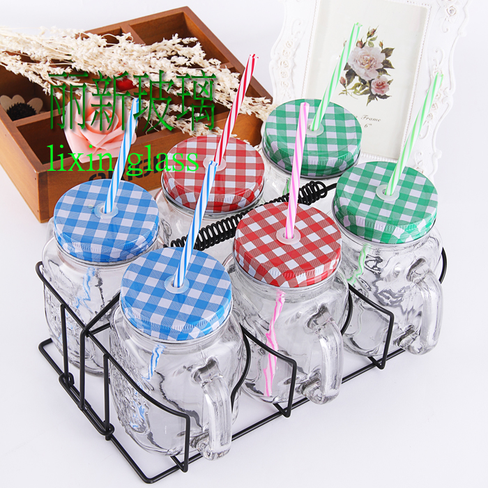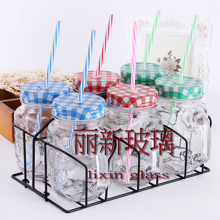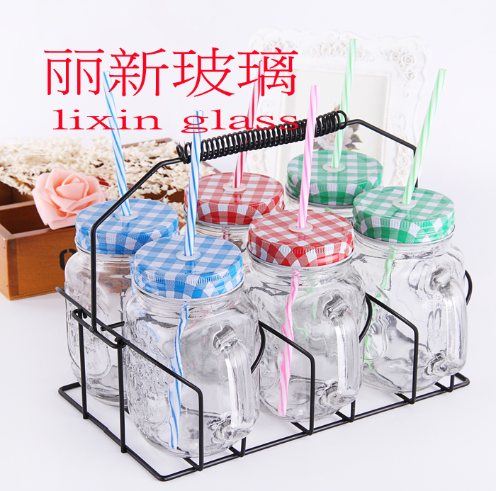 【产品材质】:无铅玻璃+格子铁盖+铁架(含吸管)