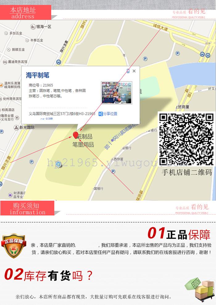 • 义乌海平制笔 主营各种广告圆珠笔,简易圆珠笔,旁跳圆珠笔,中性笔,各种圆珠笔芯,中性笔芯等。欢迎新老客户前来洽谈。
