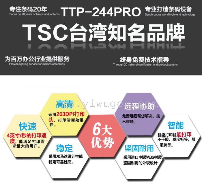 TSC TTP-244PRO 系TSC最新款桌面型打印机,B-2404和TTP-244PLUS已停产【旧型号】,内存、打印速度比上述两款更高,打印速度提升到5英寸/秒