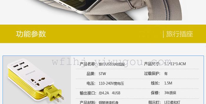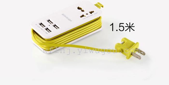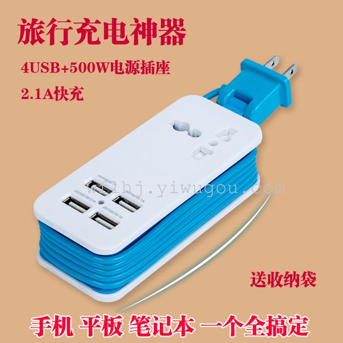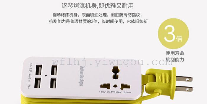 绕线式旅行充电器,做工扎实,安全便携。四USB总输出5V 4A,单口支持2.1A快充;一个电源插孔,可负载500W功率,港版插头可直接使用。