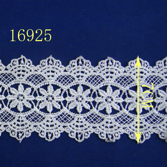 本品为定做产品,用涤纶线刺绣而成,定型水溶后手感挺刮。 长期供货,可按要求染成各种颜色,色彩亮丽,美观大方,欢迎光临。