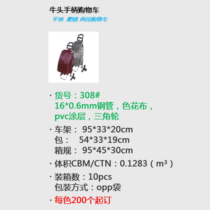 面料:600D单色/印花防水牛津布,色丁布,16*0.6mm钢管,蓝灰喷塑,配三轮(橡胶三轮,水晶三轮)