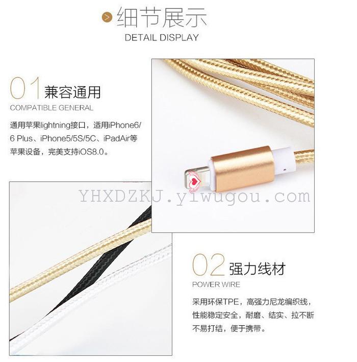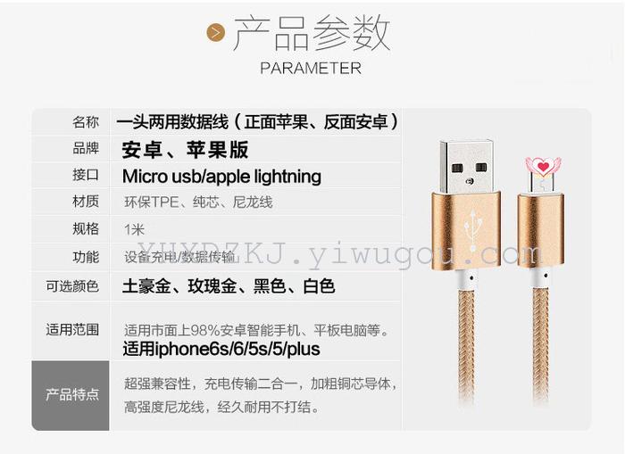 产品特点:超强兼容性,支持不同品牌设备,加粗铜导体,支持同步充电及数据传输,苹果安卓接头二合一,适用多种不同接口设备,高强度尼龙线拉扯不易断,更加耐用。