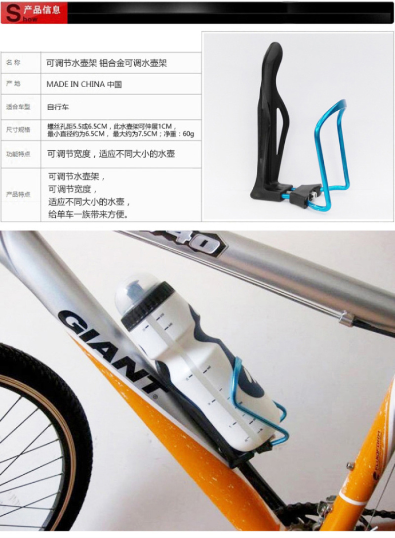 【特点】可调节水壶架,可调节宽度,适应不同大小的水壶,给单车一族带来方便。
