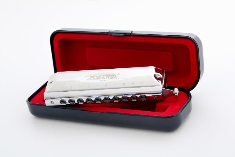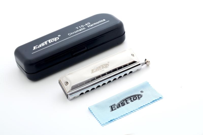 10孔40音半音阶口琴,EASTTOP牌子,铜座板,不锈钢外壳,12/内盒,48/外箱,每只口琴加一块毛巾入一只塑盒,产品都是通过欧美检测,口琴外观大气,声音清脆。欢迎询价。