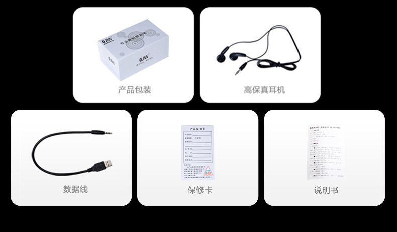 配件清单:录音笔、数据线、耳机、说明书、保修卡,合格证