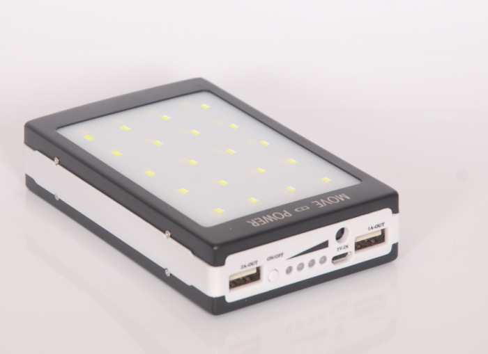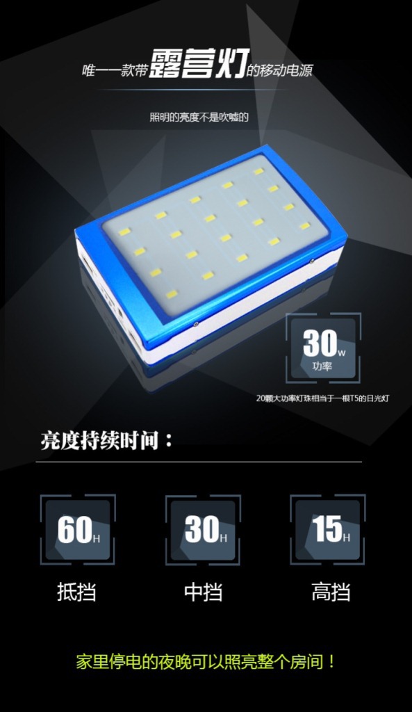 超大容量移动电源充电宝露营灯款,新款加太阳功能了,一面是LED灯板,一面是太阳能面板。20000毫安的电池容量,让您出门不用担心手机没电的问题。野外活动中,放背包里,白天充电,晚上就可以用来照明。三档调节,弱档-